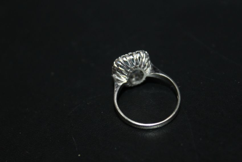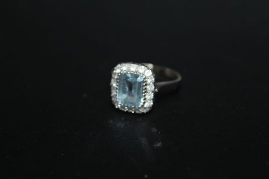 AN AQUAMARINE STYLE RING, stamped 750, centre stone untested, outer stones not diamonds, approx weight 43.5g, ring size O