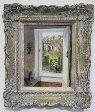 STEPHEN J DERBYSHIRE (1940). 'Washing on the Line', signed lower left, oil on board, framed, 23 x 17.5 cm