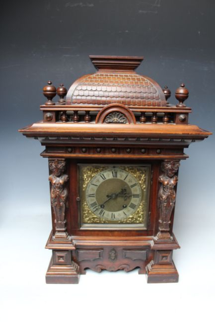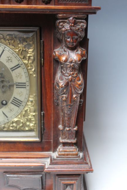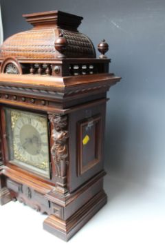 A LATE 19TH CENTURY MAHOGANY BRACKET CLOCK BY R M SCHNEKENBURGER, of architectural outline, the case with female figurative detail, H 52.5 cm