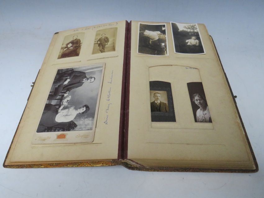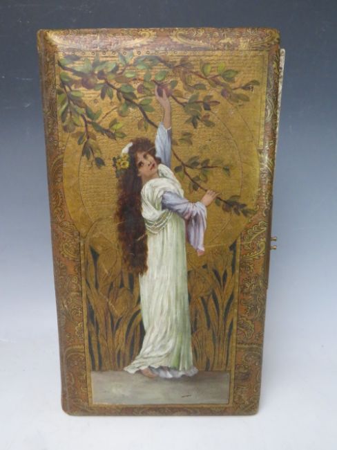A PHOTOGRAPH ALBUM DATED 1916 ON INNER COVER, with mixed media painting of a young woman in classical dress reaching for fruit on the front cover, L 34 cm, W 20 cm