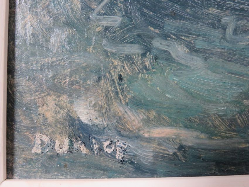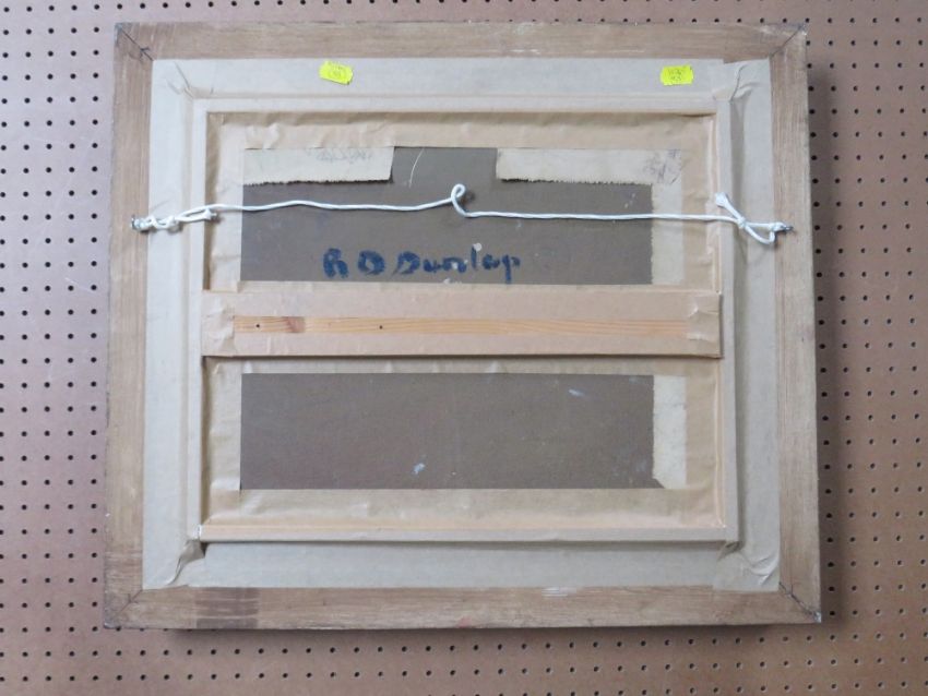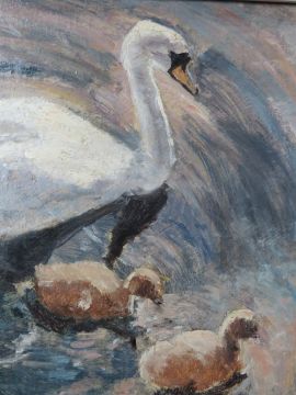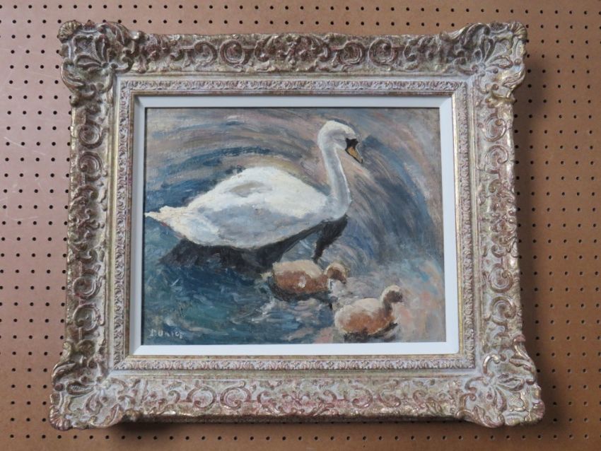 RONALD OSSORY DUNLOP (1894-1973). Impressionist study of a swan and two cygnets swimming, signed lower left, oil on board, framed, 28 x 35 cm