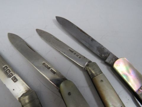 A COLLECTION OF MOTHER OF PEARL HANDLED FRUIT / PENKNIVES, to include four hallmarked silver bladed examples (6)