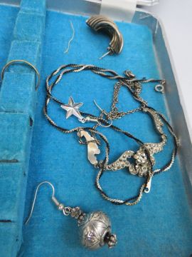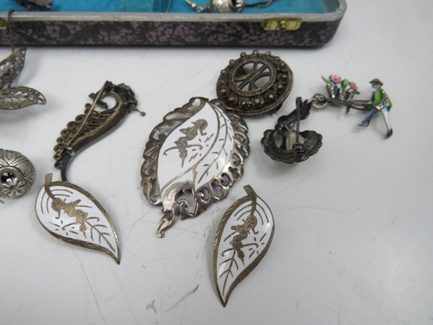 A COLLECTION OF VINTAGE SILVER AND WHITE METAL COSTUME JEWELLERY, to include a Siam silver brooch and earrings set