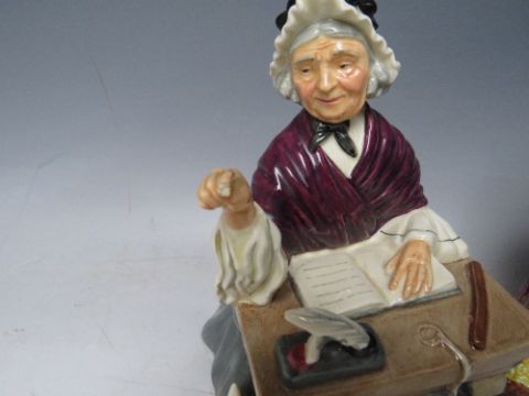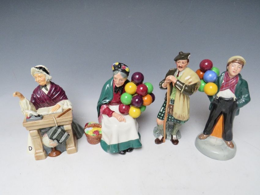 FOUR ROYAL DOULTON FIGURES TO INCLUDE 'THE LAIRD' HN 2361, 'The Old Balloon Seller' HN1315, 'Balloon boy' HN 2934 and 'Schoolmarm' HN2223 (4) S/D