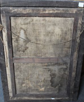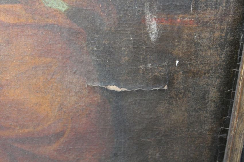 Condition Report:With an 'L' shaped tear by the left hand. Various areas of paint loss throughout.