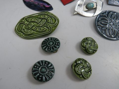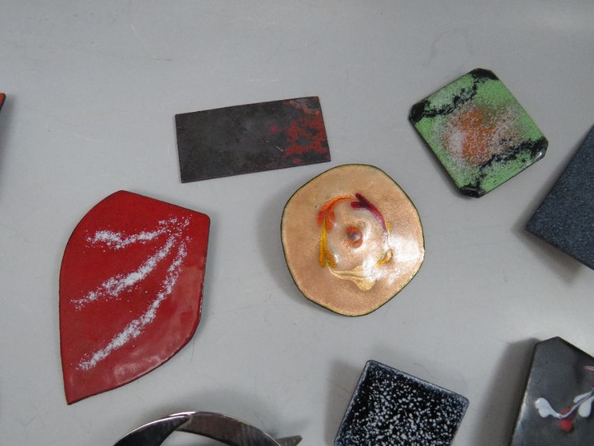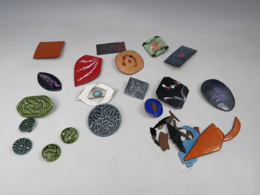 A COLLECTION OF MID CENTURY RETRO BROOCHES ETC., to include copper and ceramic examples, plus a modernist Moda brooch - hand made in Malta, (Approx 13)