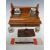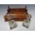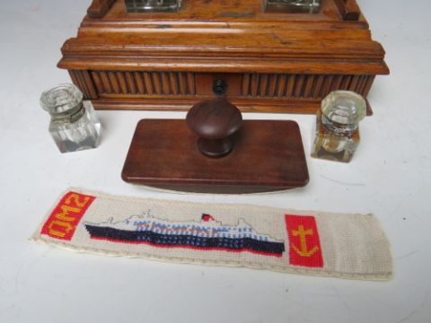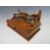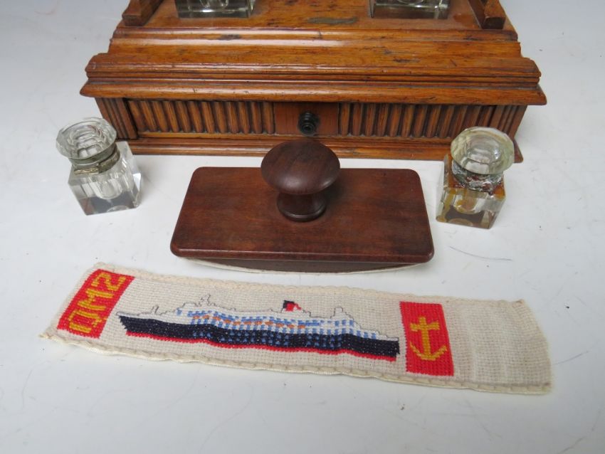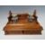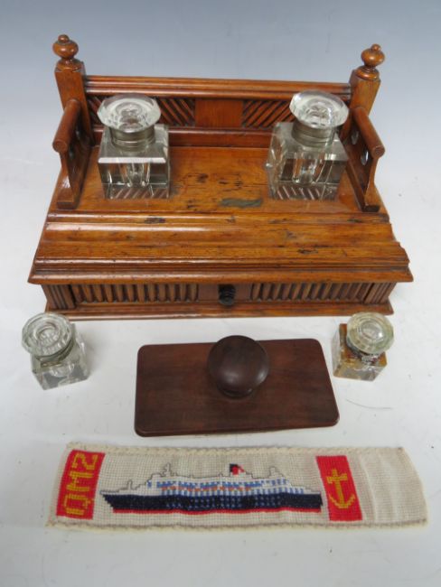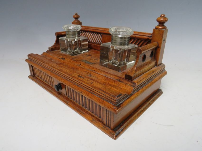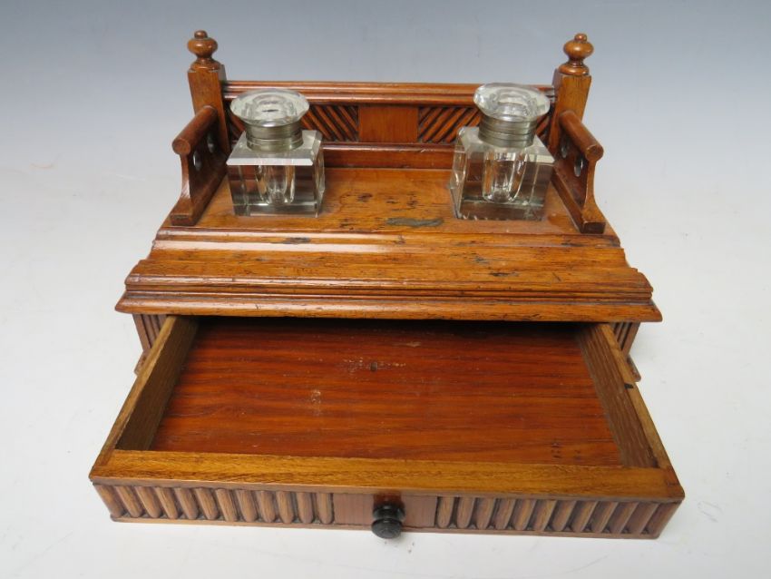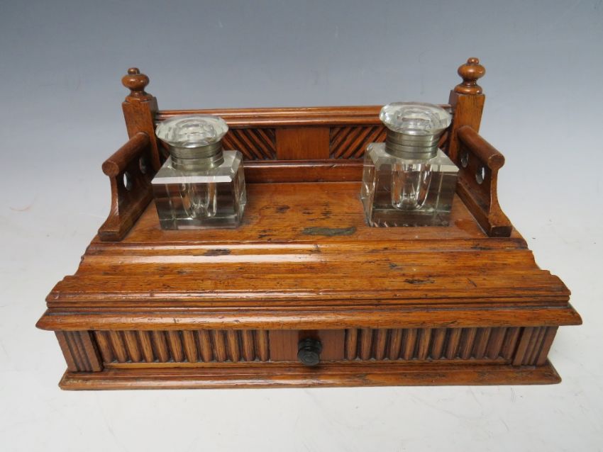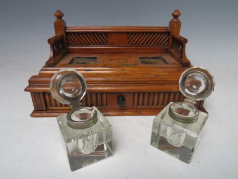 A SMALL DECORATIVE WOODEN DESK STAND WITH SINGLE DRAWER BELOW, complete with two fitted ink bottles and two similar smaller loose bottles, together with a vintage wooden 'A.B. FABER' blotter