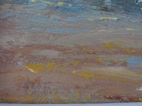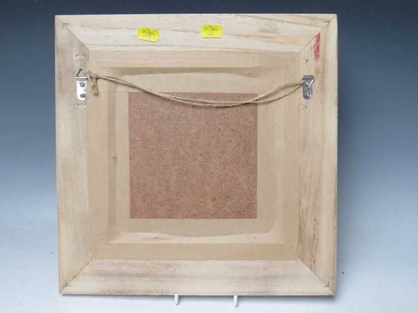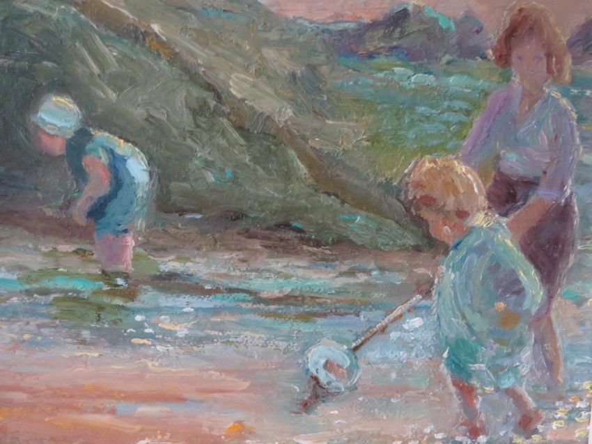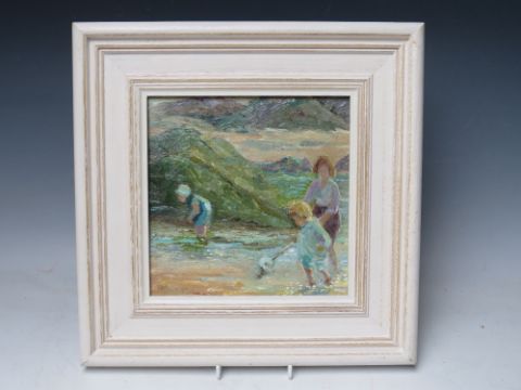 (XX). English school, impressionist rocky beach scene with woman and children searching rock pools, bears name D. SHARP verso, unsigned, oil on board, framed, 19 x 19 cm