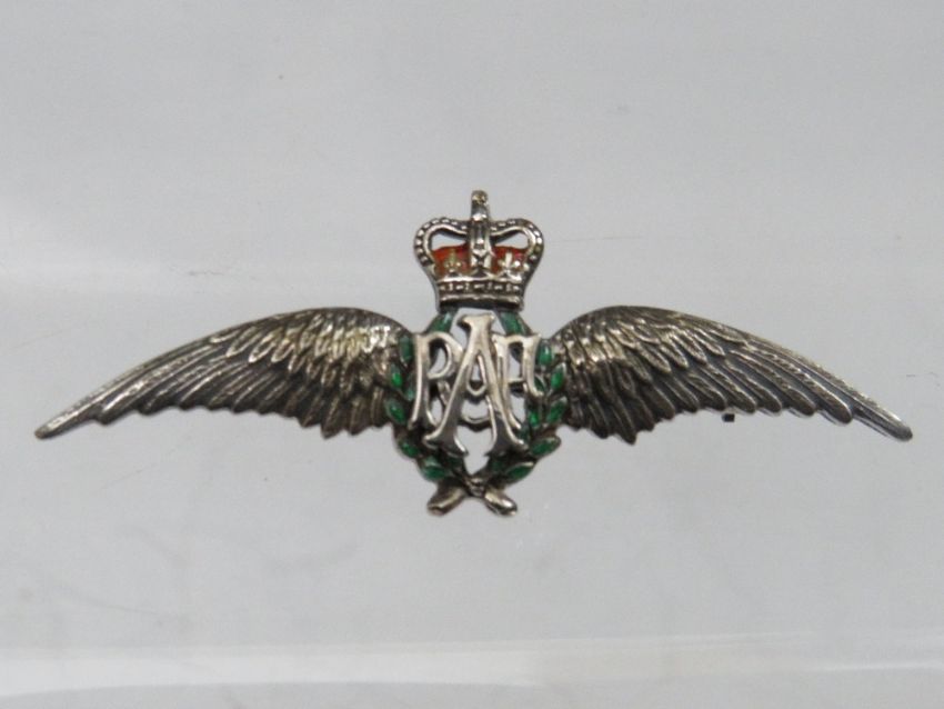 A HALLMARKED SILVER AND GUILLOCHE ENAMEL R.A.F. POWDER COMPACT, together with an RAF silver sweetheart brooch (2)