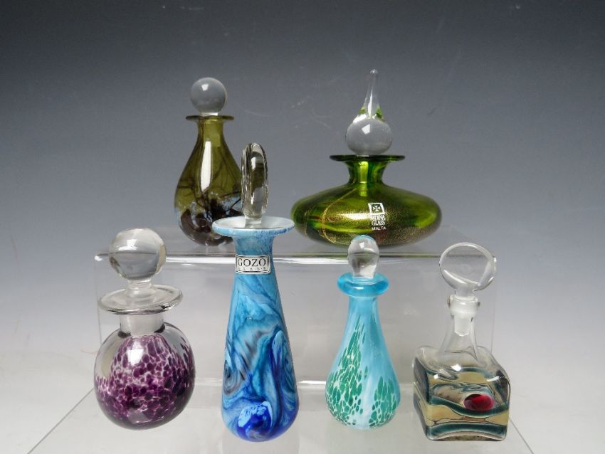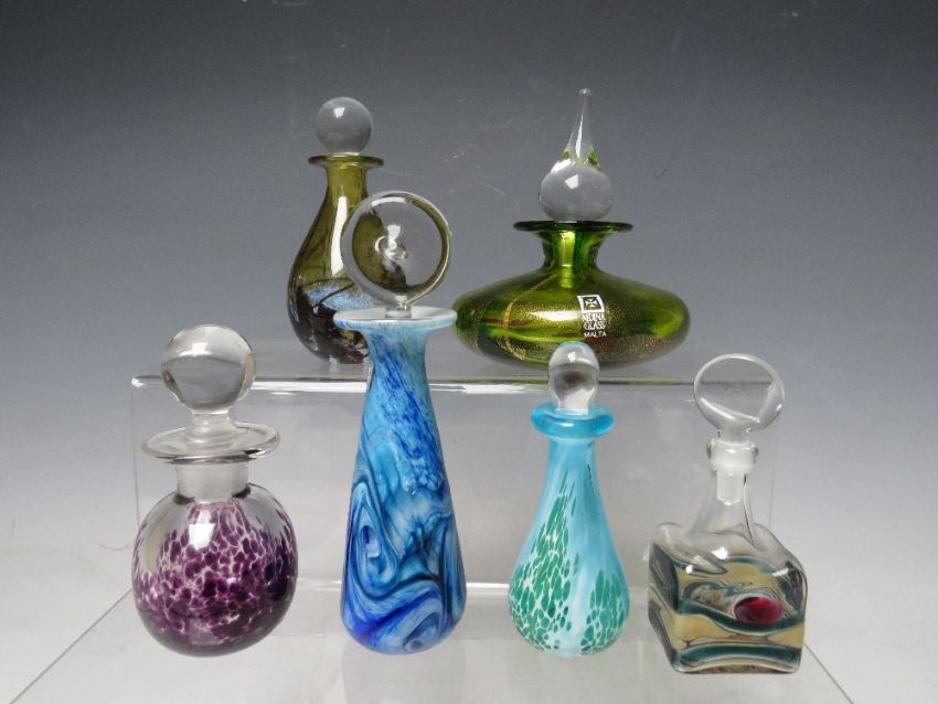 A COLLECTION OF STUDIO GLASS SCENT / PERFUME BOTTLES, to include signed examples by Mdina, Gozo Glass and Rouse etc., tallest H 13 cm (7)