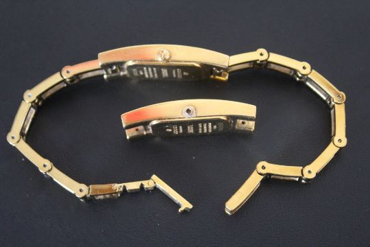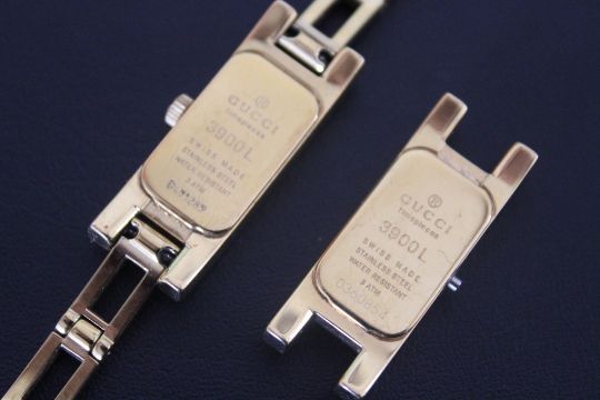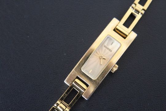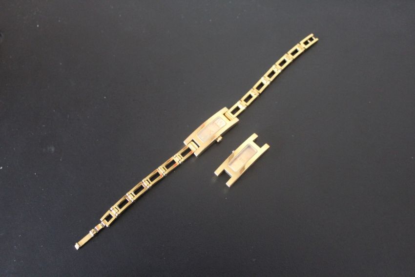 A LADIES RECTANGULAR GOLD EFFECT GUCCI WRIST WATCH, together with spare movement housing, W 1.25 cm