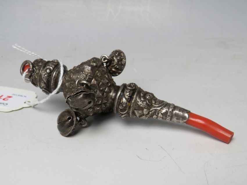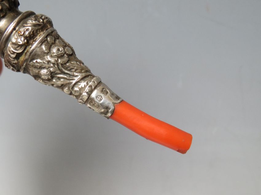 A HALLMARKED SILVER AND CORAL BABY'S TEETHER RATTLE - BIRMINGHAM 1838?, makers mark GU, H 12 cm