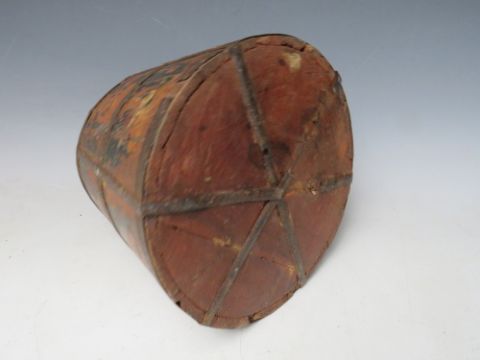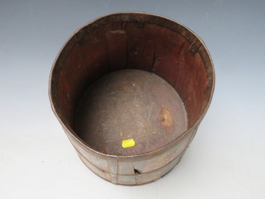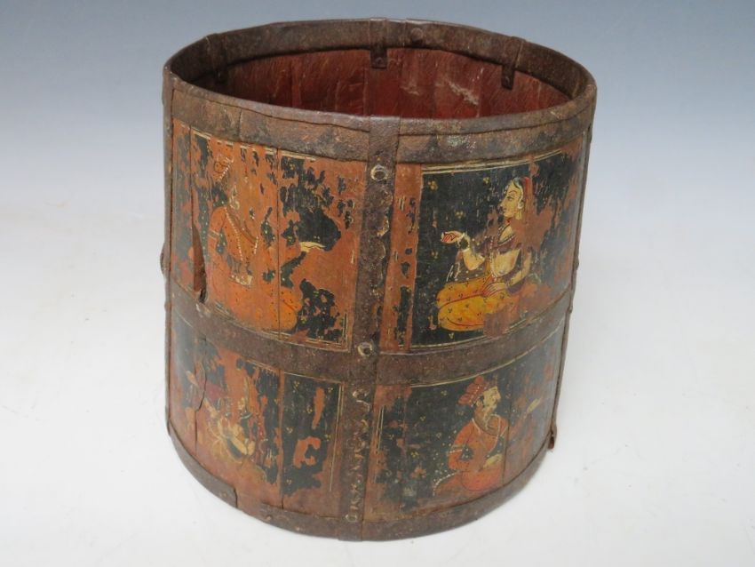 AN EARLY INDIAN SMALL COOPERED BARREL WITH TWELVE PAINTED FIGURE STUDIES, H 21 cm, base Dia. 25 cm, rim Dia. 20 cm
