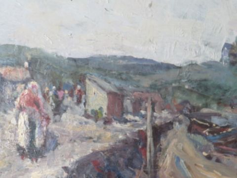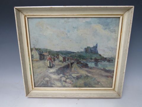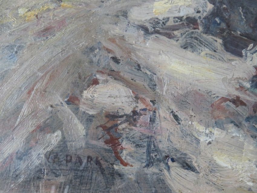 J.A.PARK (XX). Impressionist stormy, rocky coastal scene, with figures and village, signed lower left, oil on board, framed and glazed, 28 x 34 cm