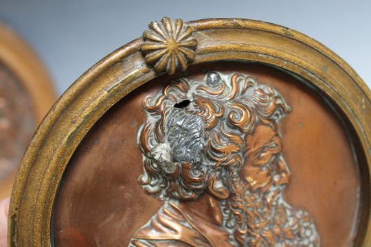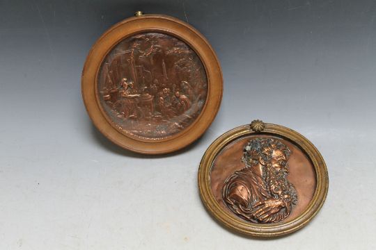 TWO COPPER CIRCULAR HANGING PLAQUES, Dia 18 cm and 16 cm