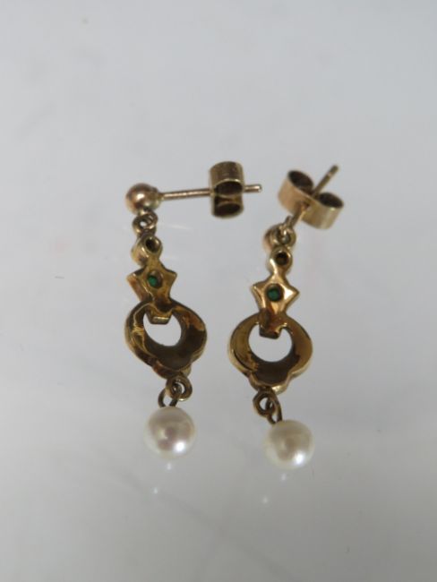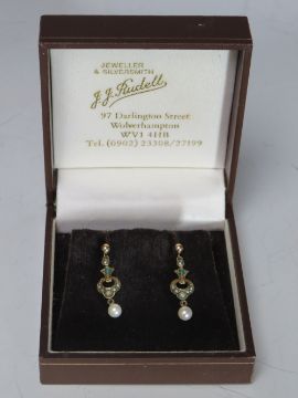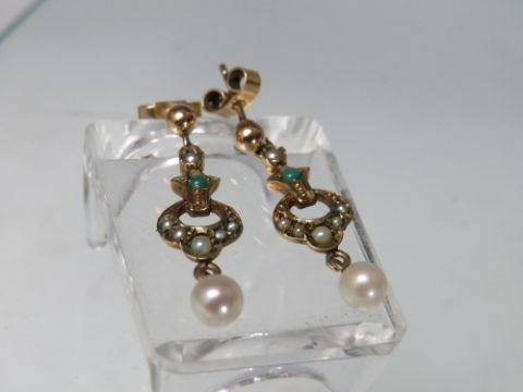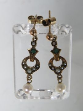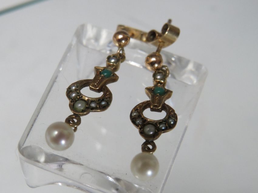 A PAIR OF 9CT GOLD VINTAGE STYLE SEED PEARL AND TURQUOISE SET EARRINGS, with pearl type dropper