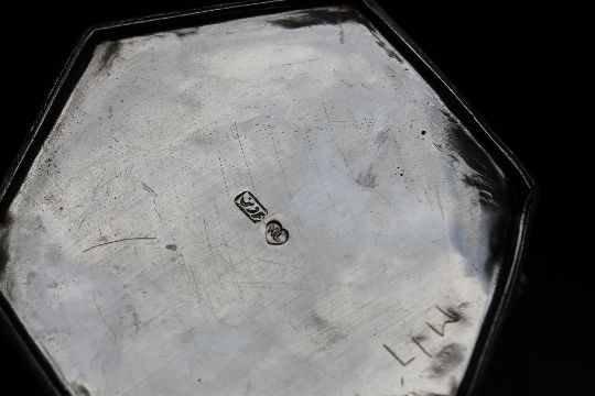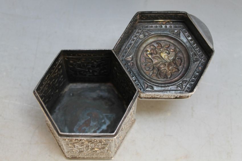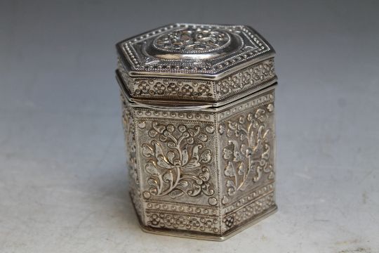 A CONTINENTAL HEXAGONAL WHITE METAL TEA CADDY, marks to base, approx weight 102g, H 8.5 cm