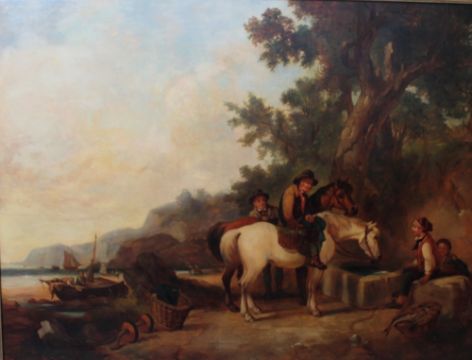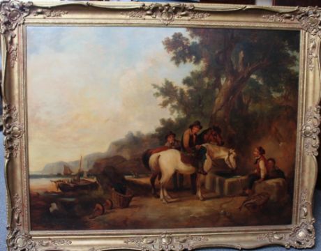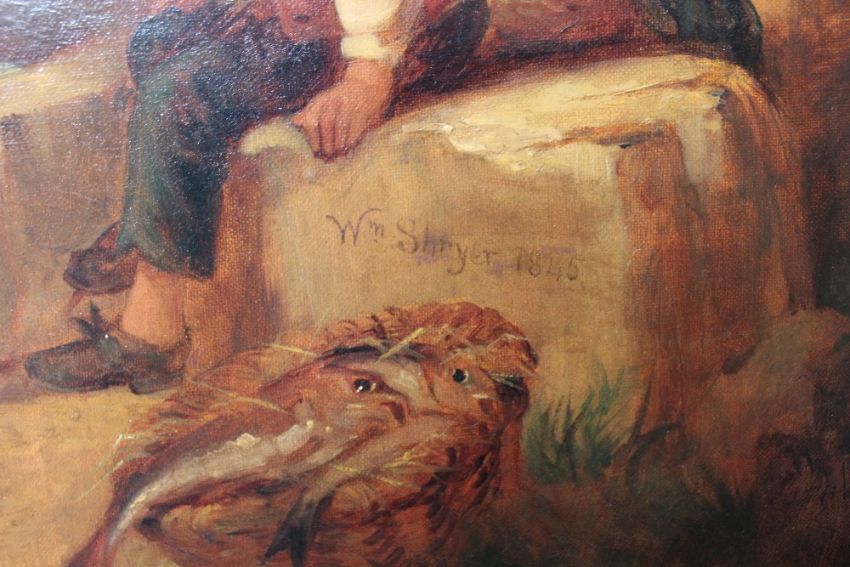 WILLIAM SHAYER SNR (1787-1879). Fisherfolk on the coast, signed lower right and dated 1845, oil on canvas, gilt framed, 75 x 100.5 cm