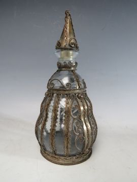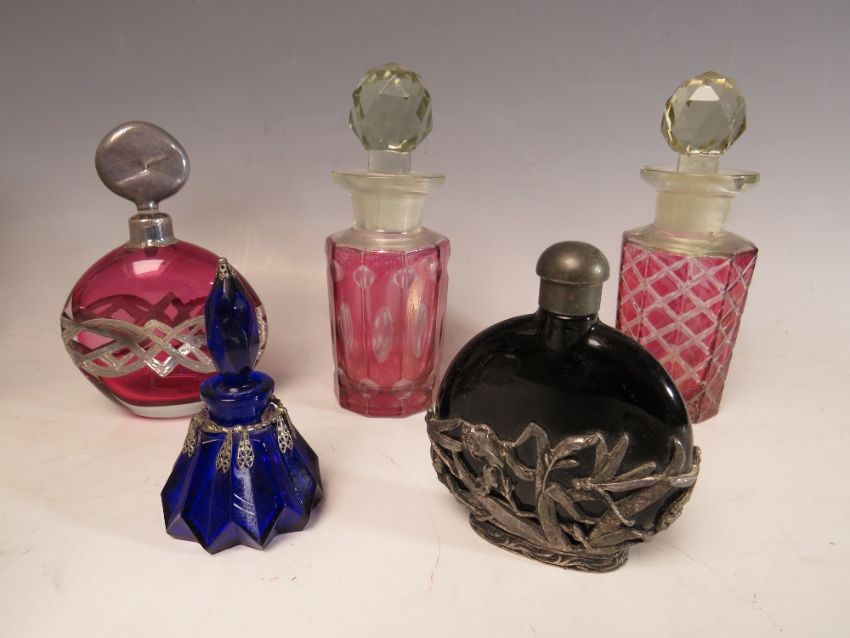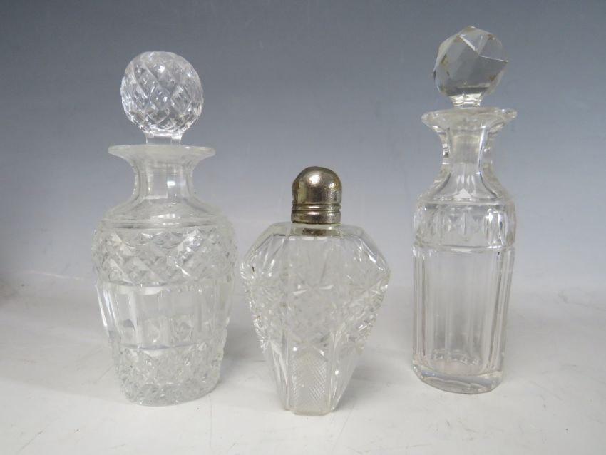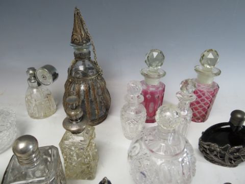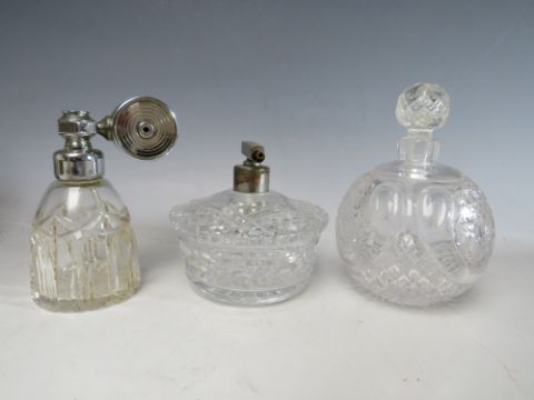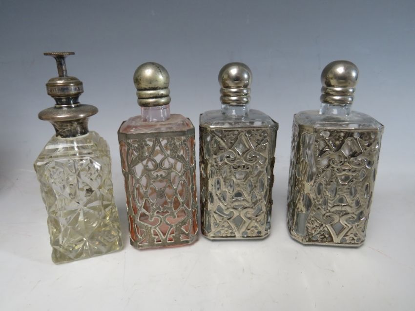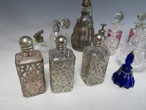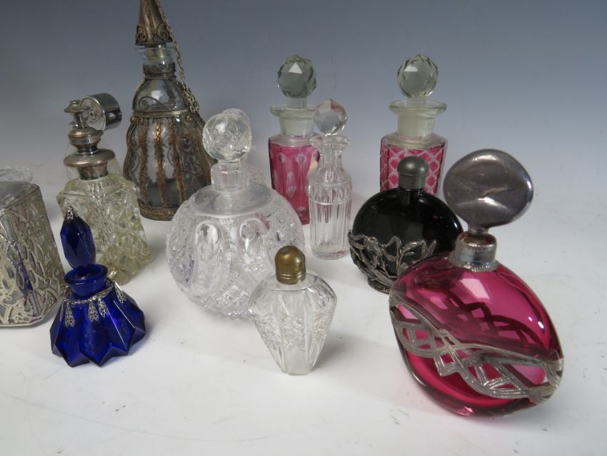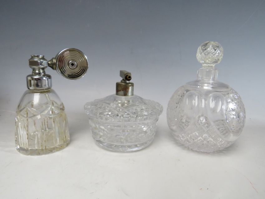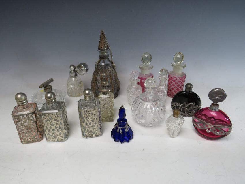 A COLLECTION OF SIXTEEN ASSORTED GLASS PERFUME BOTTLES, ATOMISERS, VANITY JARS ETC., to include a set of three metal encased and lidded vanity jars, coloured glass examples etc. (16)