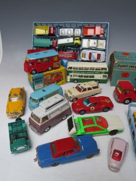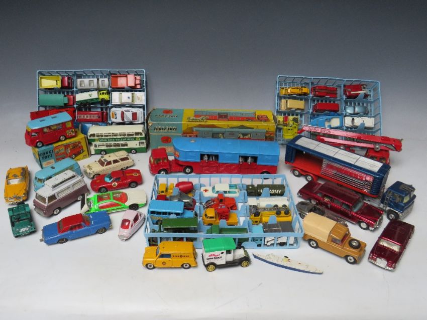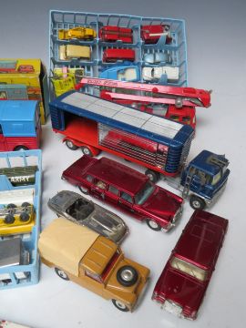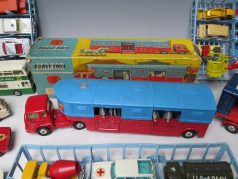 A COLLECTION OF ASSORTED DINKY AND CORGI DIE CAST VEHICLES, to include a boxed circus horse transported with horses - No. 1130, various unboxed examples and a boxed Chipperfields circus mobile booking office -No. 426
