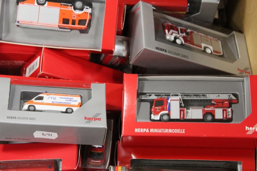 OVER 120 BOXED SMALL SCALE FIRE RELATED VEHICLES, mostly 1:87 scale with a few 1:76 scale, 3 by Herpa, 28 by Busch, 13 by Rietz Model, 21 by Wiking, rest mixed