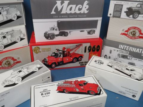 THIRTEEN BOXED FIRST GEAR VEHICLES, to include 1960 Mack Chicago Fire Department tow truck 1:25 scale, 1960 Mack B Model tractor trailer 1:34 scale, 1957 International R190 fire truck 1:34 scale etc