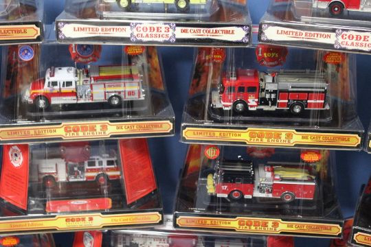 SIXTEEN BOXED CODE 3 COLLECTABLES 1:64 SCALE LIMITED EDITION FIRE ENGINES, to include FDNY Aerialscope, Yonkers American LaFrance Tower Ladder, Ontario, LA County etc.