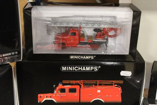 FIVE BOXED MINICHAMPS MAGIRUS DEUTZ MERKUR FIRE ENGINES, together with five other 1:43 scale Minichamps emergency services vehicles
