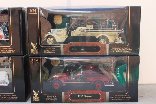 SIGNATURE SERIES - A COLLECTION OF FOUR BOXED DIE CAST 1:24 SCALE MODEL FIRE TRUCKS / ENGINES, comprising a 1938 Ahrens Fox VC, a 1927 Seagrave, Ford 1938 fire engine and a 1941 GMC firetruck all with gold plated coin plaques (4)