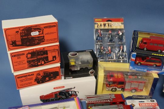 TWENTY NINE BOXED FIRE SERVICE VEHICLES, to include Eligor Double Cabin Scania, Wiking, 1:43 scale Rosenbaur Fire Engine, 3 x RSH fire Engines, 8 x Pedal Power Vehicles (not all fire related), Siku, Junior Rescue etc., together with four carded items and twenty unboxed fire service vehicles