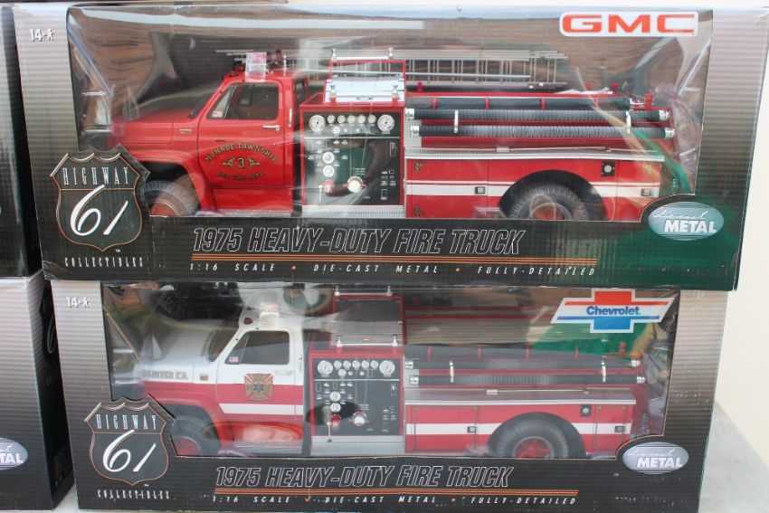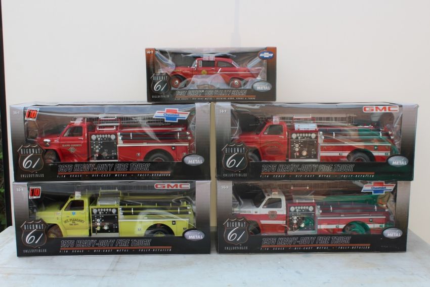 HIGHWAY 61 COLLECTIBLES - FOUR BOXED HEAVY DUTY FIRE TRUCKS, 1:16 die cast models, together with a 1957 Chevy 150 utility Sedan, 1:18 scale (5)