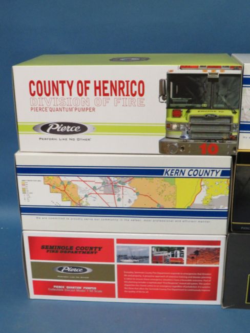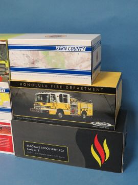 SIX BOXED 1:50 SCALE MODEL FIRE ENGINES, by Pierce, Kern County etc
