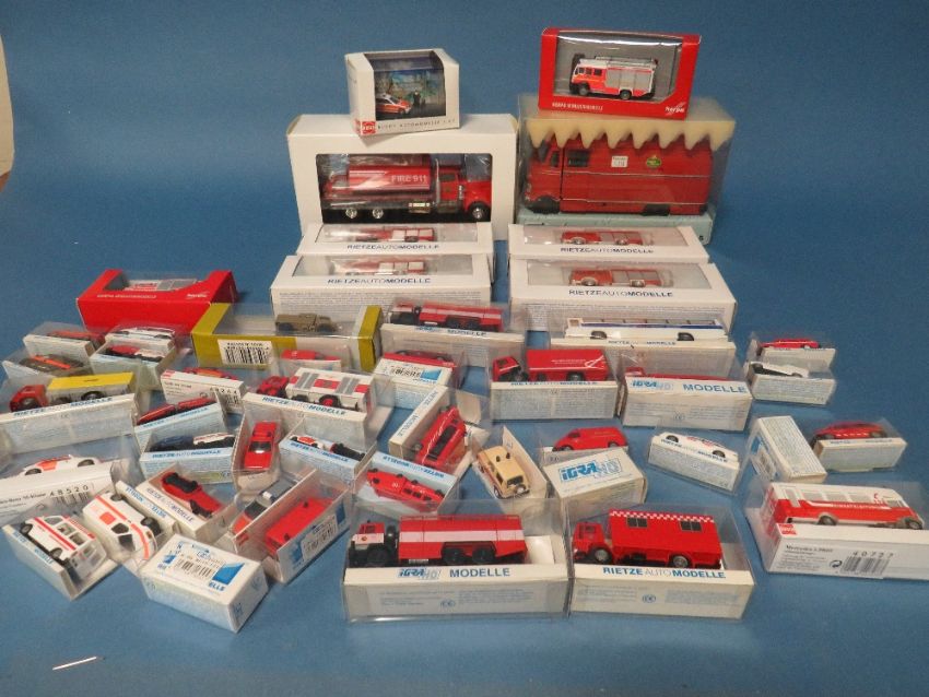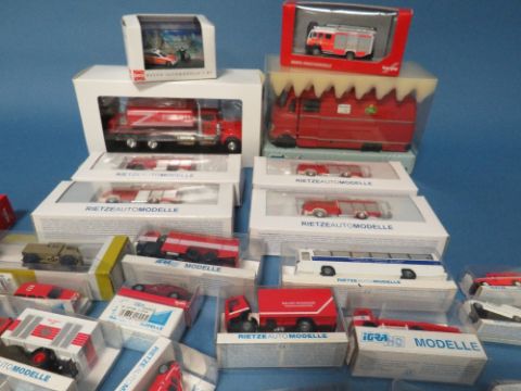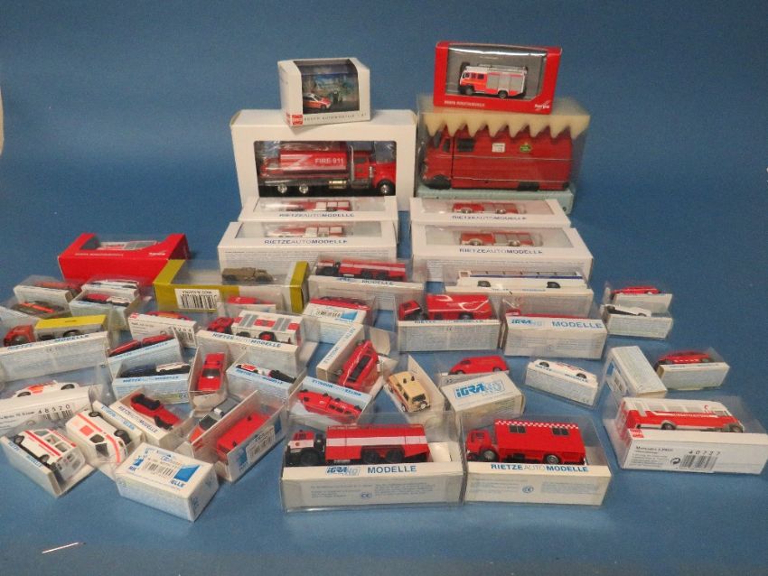 A BOXED ELIGOR KENWORTH FIRE ENGINE 1:43 SCALE, Rietze Auto Modelle Mercedes L319 together with a large quantity of small scale Rietze Auto Modelle Emergency service vehicles, mainly 1:87 scale, over 50 items in total