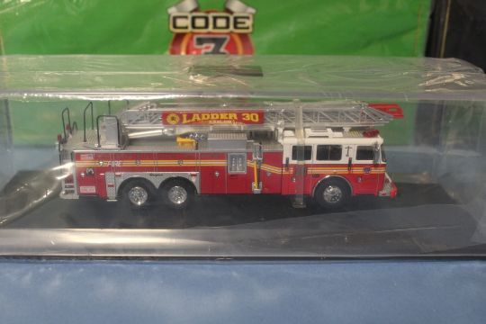 SEVEN BOXED CODE 3 FIRE ENGINES, all 1:64 scale, all limited edition, to include Boston Fire Department, Cedar Hill Dash Rear Mount Ladder, Chicago Mack Ladder, Seagrave Aerialscope ladder etc.