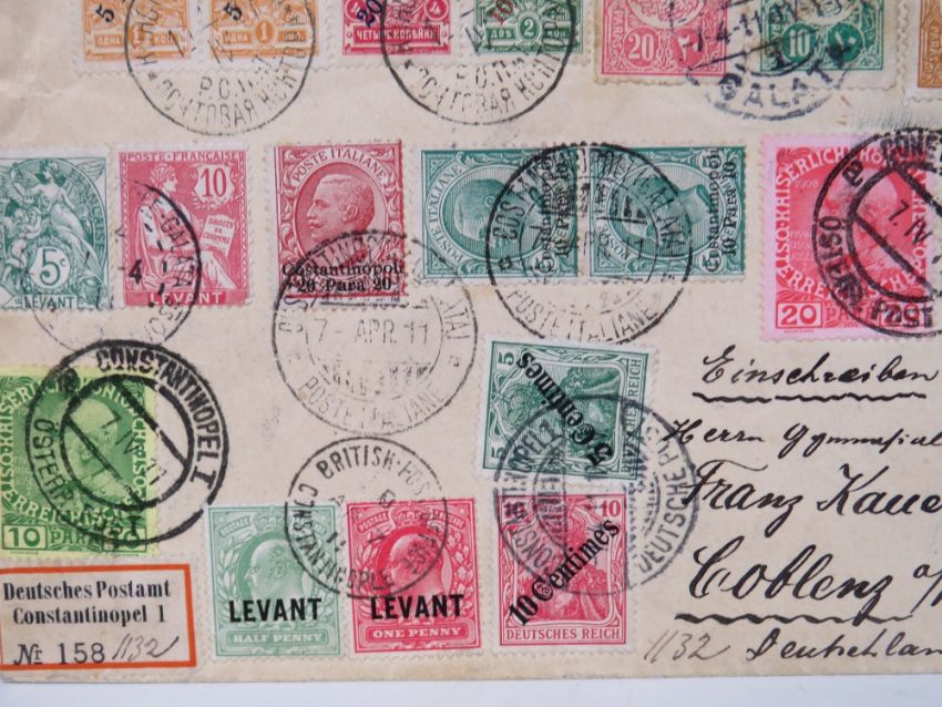 1911 COVER - CONSTANTINOPLE TO COBLENZ GERMANY WITH STAMPS, (correctly cancelled) from all P.O.'s in the Levant)