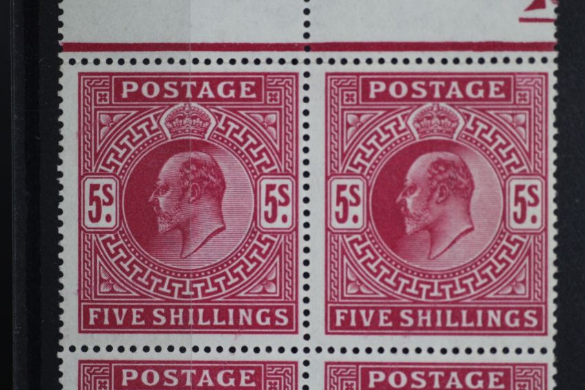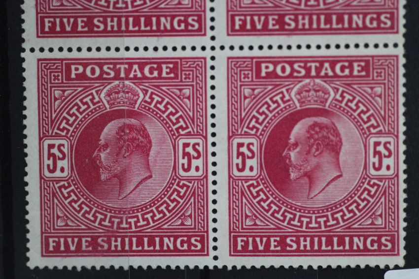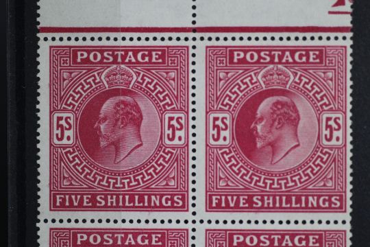 S.G. 263 5/= BRIGHT CARMINE, a fine UN/M, top marginal block of 4
