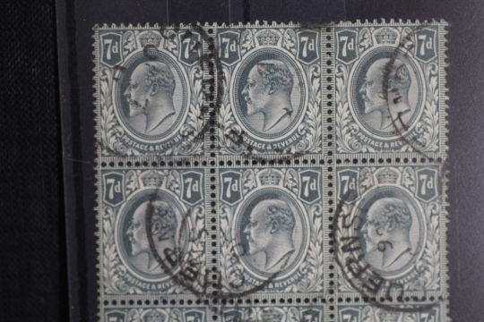 S.G. 249 KING EDWARD 7d GREY - BLACK, a FU block of nine with GUERNSEY CDS