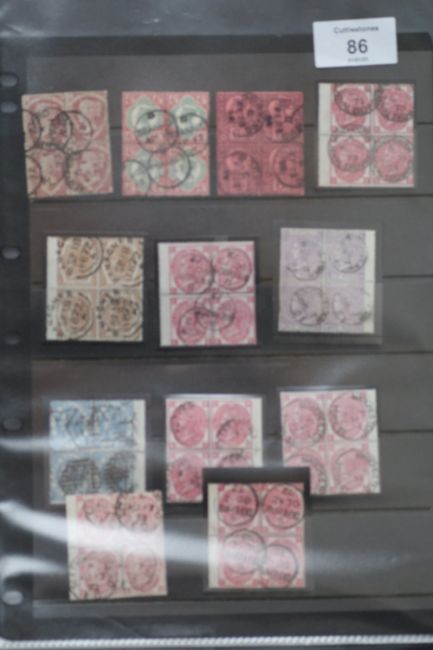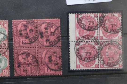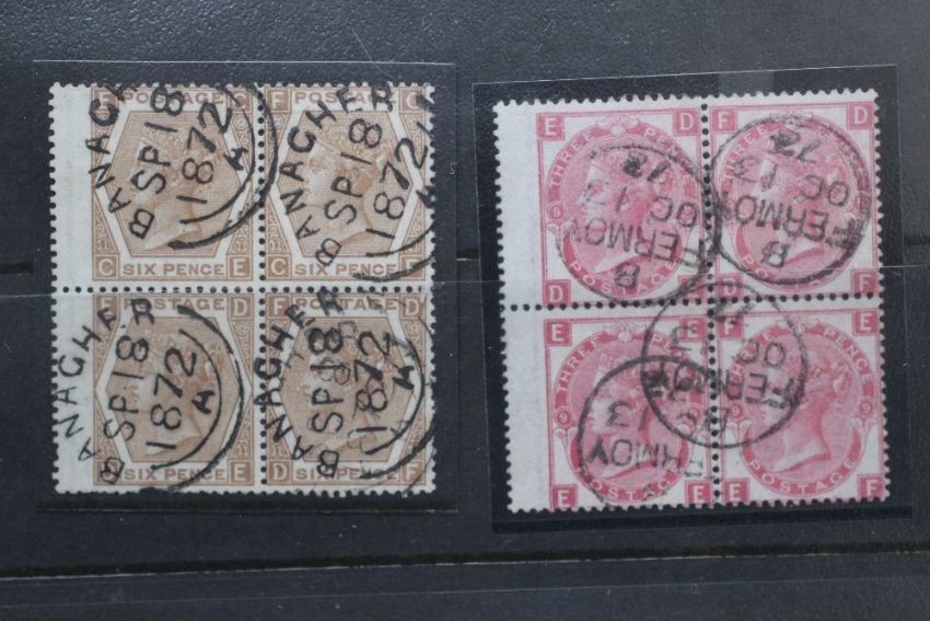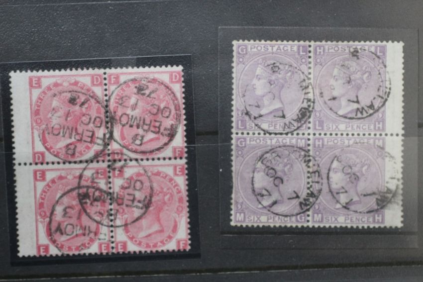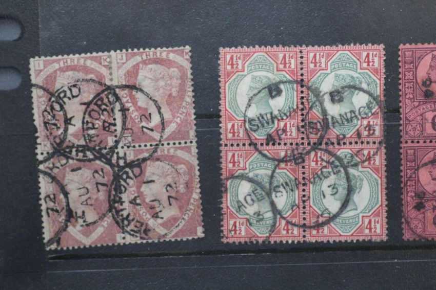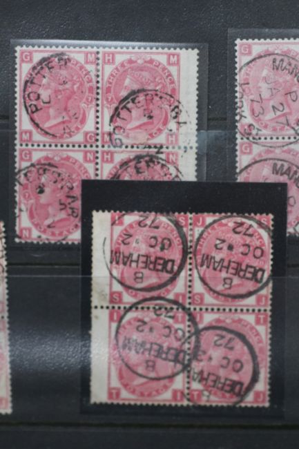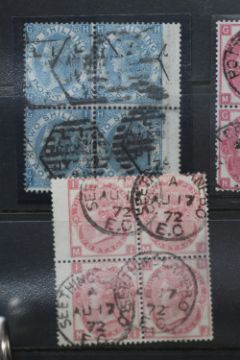 RANGE Q.V., FU blocks of four (12 blocks), mainly 1807 3d plates, 6d chestnut, 2/= blue (S.G. £3.720)