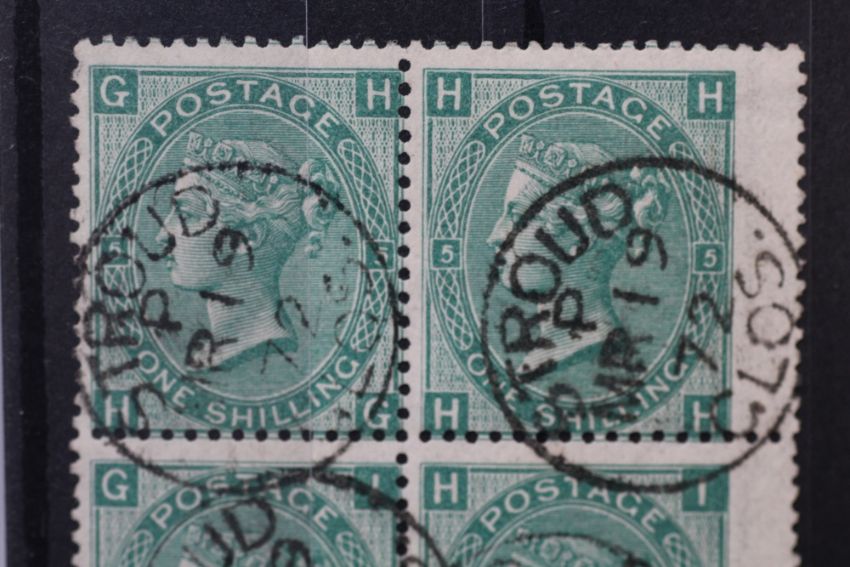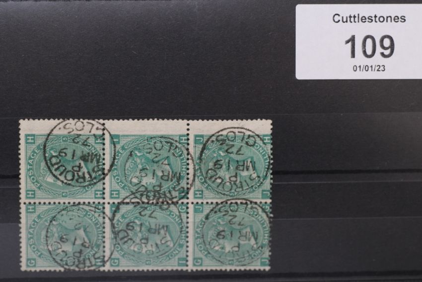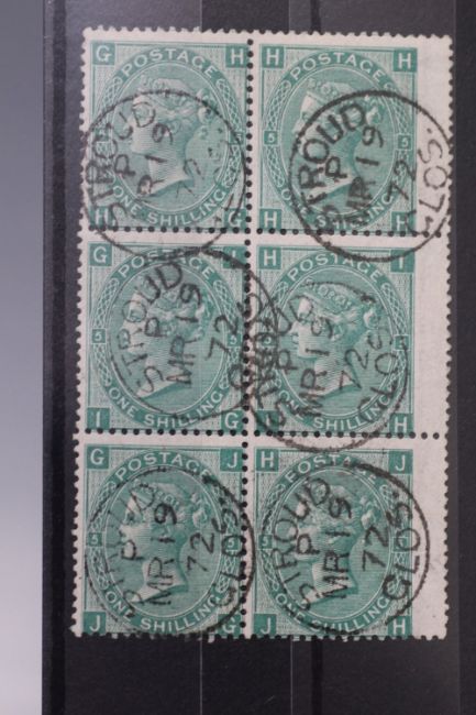 S.G. 117 1/= GREEN, plate 5, a superb used block of six, with Stroud CDS
