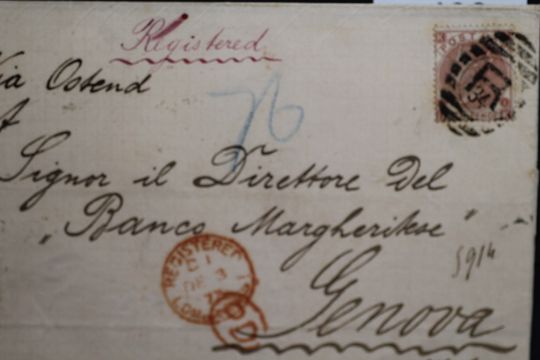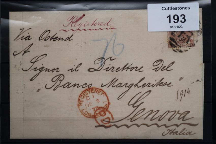 S.G. 114 1867 10d, plate 1 on registered entire to Genoa