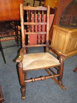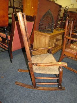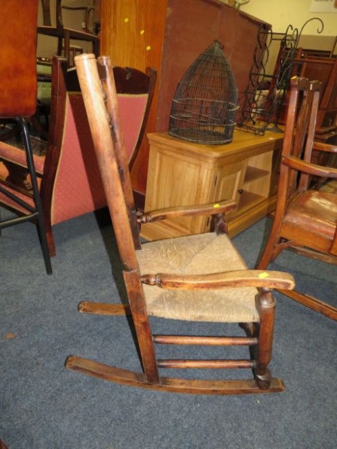 A PERIOD MAHOGANY ARMCHAIR TOGETHER WITH AN OAK WICKERSEAT ROCKING CHAIR (2)