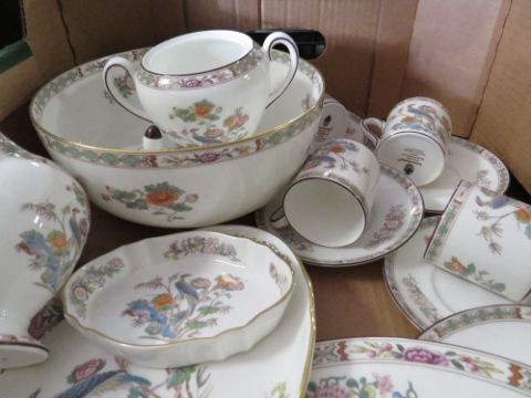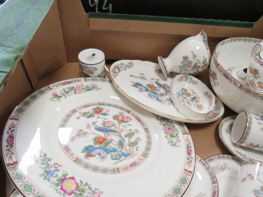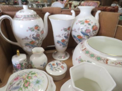 TWO TRAYS OF WEDGWOOD 'KUTANI CRANE' PATTERN COFFEE SET, DECORATIVE VASES, TRINKETS ETC