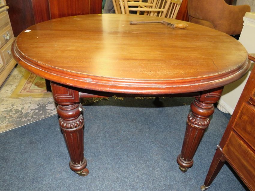 A SMALL VICTORIAN MAHOGANY WIND-OUT DINING TABLE WITH THREE SPARE LEAVES L-120 CM EXTENDED 236 CM - HANDLE
