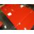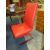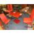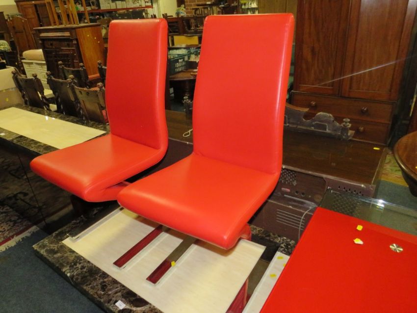 A MODERN GLASS KITCHEN TABLE WITH FOUR RED CHAIRS