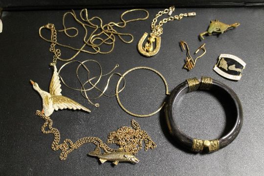 A SMALL QUANTITY IF YELLOW METAL ETC TO INCLUDE A GILT MOUNTED BANGLE