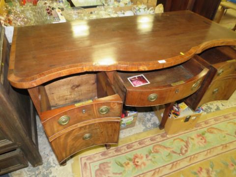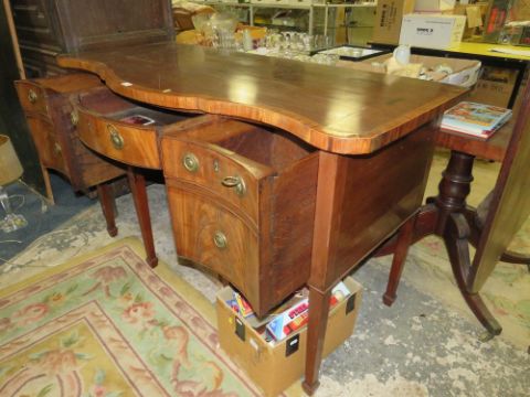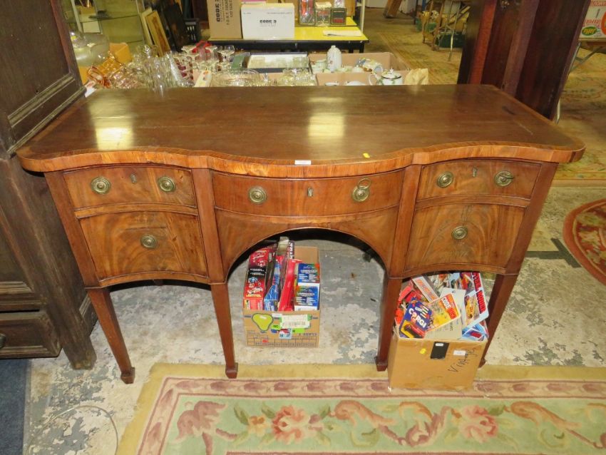 A 19TH CENTURY MAHOGANY SERPENTINE FRONTED SIDEBOARD WITH CROSSBANDED DETAIL H-92 W-151 CM