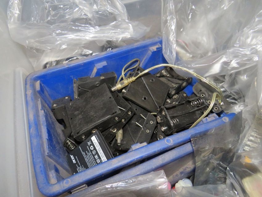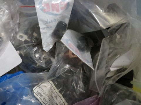 A LARGE SELECTION OF ELECTRONIC AND ELECTRICAL COMPONENTS, TO INCLUDE CAPACITORS, MINIATURE RELAYS, CONNECTING BLOCKS, VARIOUS DIN PLUGS, I C MOUNTING SADDLES, SERIAL CONNECTING BLOCKS, SHROUDS, GROMMETS AND BATTERY TRAYS ETC