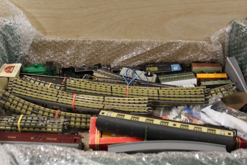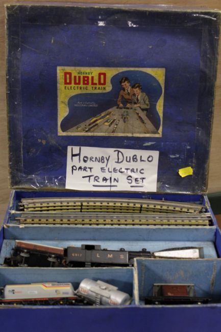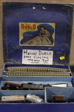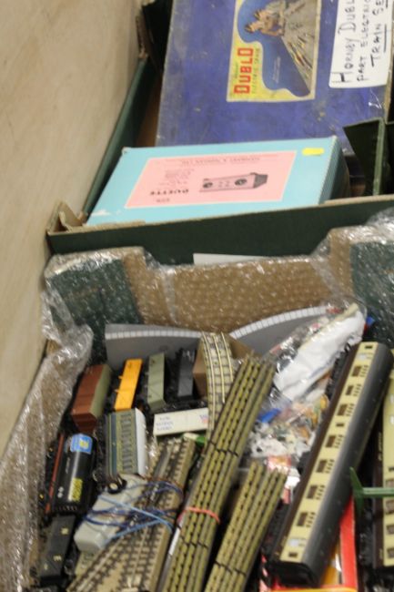 TWO TRAYS OF MODEL RAILWAY AND ACCESSORIES TO INCLUDE A HORNBY DUBLO PART TRAIN SET, ROLLING STOCK AND TRACK