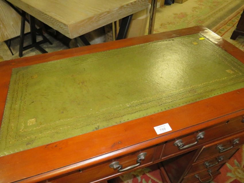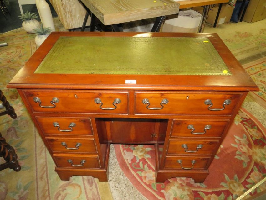 A MODERN LEATHER TOPPED YEW TWIN PEDESTAL DESK W-92 CM