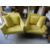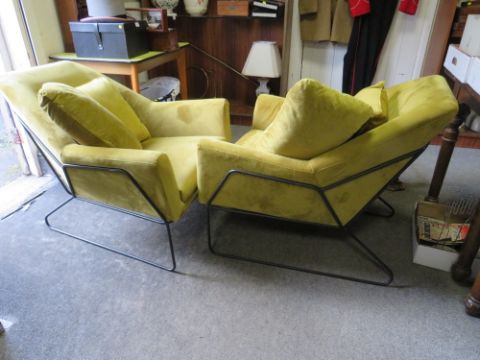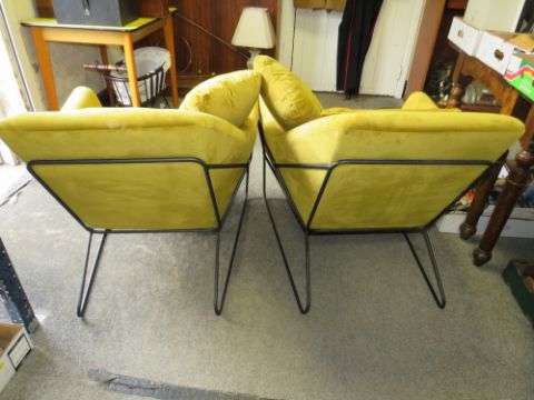 A PAIR OF MODERN MUSTARD COLOURED ARMCHAIRS WITH METAL BASES